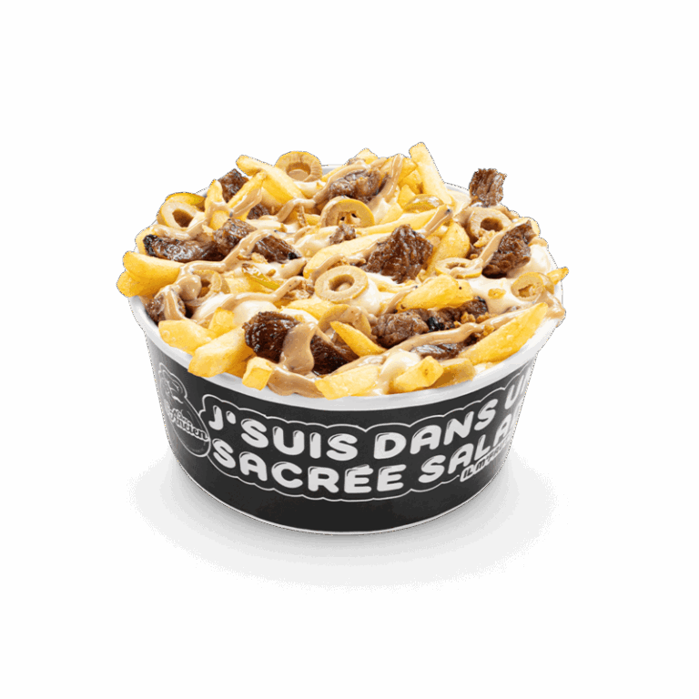 Boeuf mariné, olives, cheddar, oignons crispy, assortiment de ligumes marinés, sauce fumée