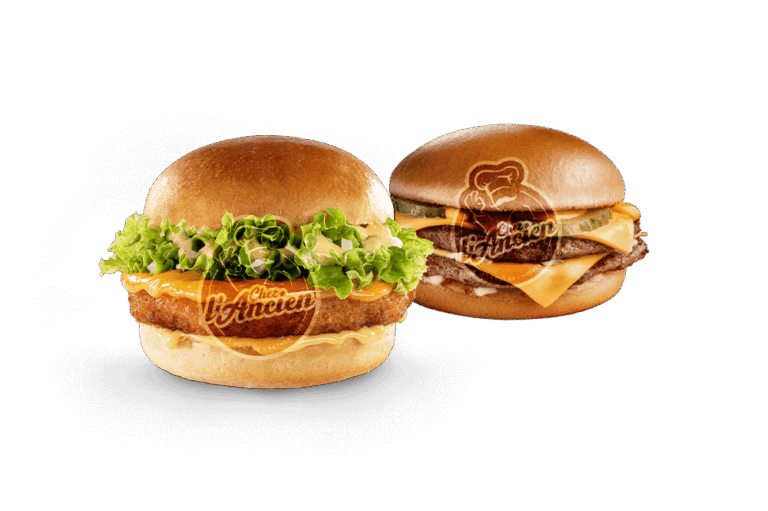 3 steaks frais, oignons blanc, salade, cornichons, cheddar, ketchup, moutarde